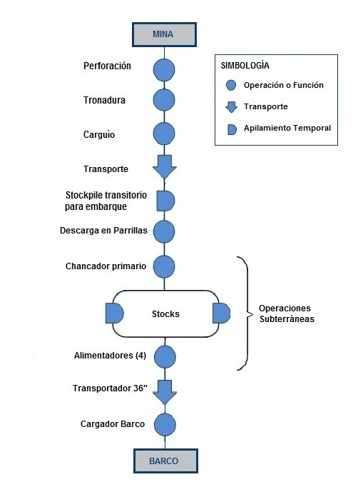Proceso se efectúa con el apoyo de dos camiones 8x4, Mercedes Actros 4144k, y Cargador Frontal CAT 966H, trasladando material fino desde canchas de acopio hasta Buzón Molino N°1, aprox. 1,4 km de distancia, concluyendo la tarea descarga en el buzón, para ser procesado en molienda, y posteriormente enviado vía concentraducto hacia Puerto Punta Totoralillo